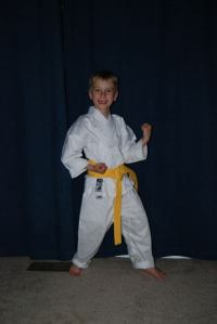 As you can see from the pictures Sam earned his gold belt in Karate last night. He tested last week and his instructor had to evaluate his test over the weekend. Sam waited very patiently throughout the entire class and in the last minute, he was awarded his belt. He is so excited and so are we! Great work!