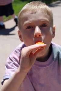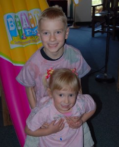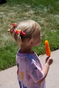 Sam, Alice and Paige attended vacation bible school at our church this past week. They sang, danced, snacked, worshipped, crafted and generally enjoyed themselves all week. I thoroughly enjoyed my alone time…I ran, hiked, enjoyed chai’s, shopped and had a great week! Sorry, Laura, but somebody had to do it! One of the VBS crafts was Tye-dying t-shirts. The kids stamped VBS 2008 on the back and wore them for the performance on the last day where they sang a couple songs for all the parents. Afterwards, the church served a picnic lunch. As you can see from the pictures, my kids definitely loved the dessert…Popsicles. Paige was a little unsure about my leaving every morning but warmed up quickly and had a blast. She had great teachers that kept her engaged (distracted) as I left. Singing was her favorite part of VBS! That did not surprise me. Enjoy the pics!!