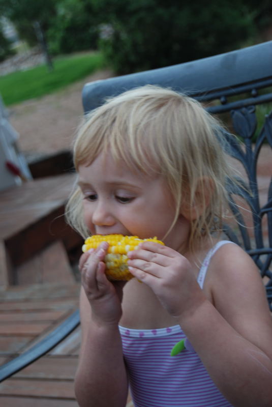 …..We finished the evening yesterday with dinner on the deck (where else?!?). Papa Jerry~ I took the last picture for you. All the kids love corn, but Paige thought it was too yummy. She didn’t like eating it with the holders (that might be too clean) so she took those off and dug in.