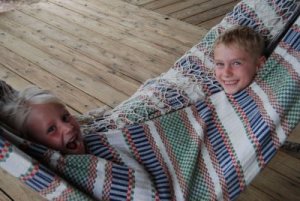 Ellie and Sam wrapped up in the hammock, relaxing at the cabin