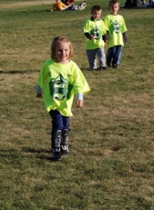 Okay, on to Wednesday. Alice had her first soccer game. Her team name is the Cyber Rays. The Cyber Rays??? What exactly is a cyber ray?. Not sure. What I do know is she is an adorable one with her neon green/yellow shirt hanging down over her knees. Please don’t get me going on the color of the shirt. No kidding, I am pretty sure it glows in the dark. Don’t look at it too long, your eyes might burn. Go Alice, Go! 5 year old soccer is so much fun to watch!