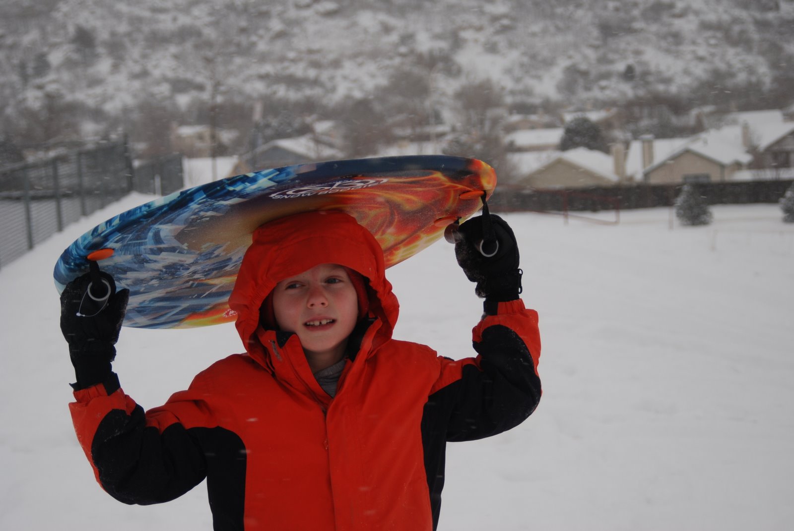 Sam got this super cool sled for Christmas from Santa. The only problem was that on Christmas it was 55 degrees and sunny, not a lick of snow anywhere. The day was beautiful and while the kids were opening presents we had the back door propped open and man were we enjoying the beautiful weather. Well, we left for Michigan for a week and that sled stayed under the tree. When we returned home on Saturday the weather still looked nice although we could see the storm clouds looming over the mountains. By mid afternoon the flakes started to fall and they didn’t stop until Sunday evening. We got about a foot of snow! It was so pretty around here. I really love all the weather in Colorado, sunny, snowy. So…I bet you can guess what we did. Sledding!!! Wow, I was just tired from getting all three kids is winter wear. We all had a ton of fun and left cold and happy.