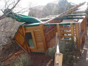 Okay….maybe not windy. While we were gone, CS had a bad wind storm and our playground (that is what the kids call it) blew over, broke up and landed half in the ravine. Here is the damage.