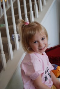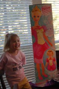 Paige and her “Big” Barbie hangin’ out and chatting under the foyer table. Paige loves her dolls and spends lots of time talking to them. It is very sweet. If the house is quiet, I can bet she is playing with her babies in her room.