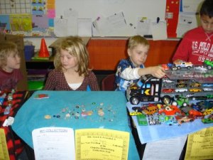 Sam had collection day at school. All the 1st graders brought in a collection that they had and displayed it for the other students and parents. Totally adorable! Here is Sam and his friends with their collections. Sam brought his car collection. I believe he had 87 cars there.