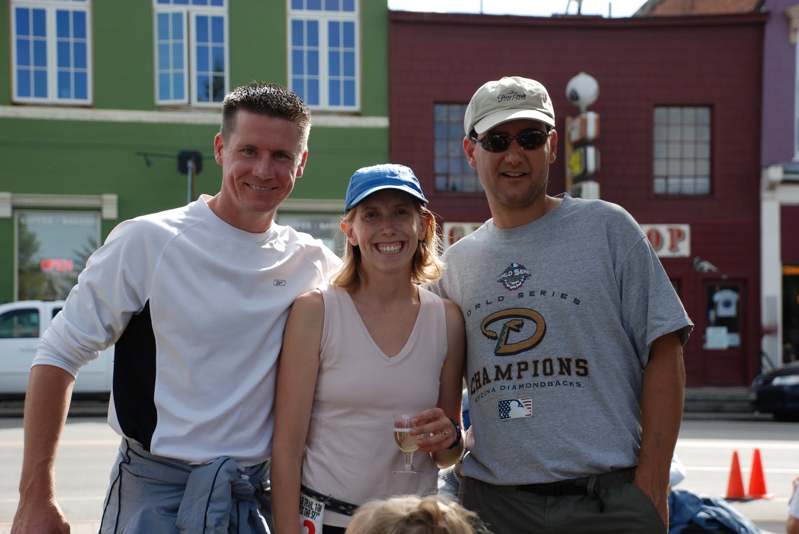 The crew. Kent (left), John (right) and I all paced Scott during the last 50 miles. John also crewed the whole race and kept Scott supplied with water, food, clothes and moral support.Yes, I am drinking champagne. I get to celebrate too because I am no longer a running widow. Well, not for a while at least 🙂