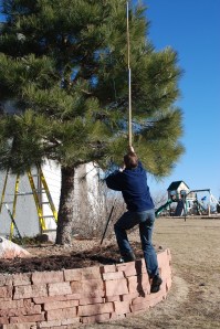 That’s right, we are making the outside of our house festive. We weren’t going to put up lights this year. We had decided that with the kids it was too much work and that with the garland and wreath on the door we were finished with outdoor decorating. Well, we woke up this morning and decided that it would be fun to put up a strand or two. Unfortunately, we never learn our lesson and we are now up to our ears in Christmas lights. Thank goodness for the warm weather. We all spent the afternoon outside enjoying the warm sun on our faces and the spirit of Christmas in our hearts. Merry Christmas to all and to all a BRIGHT night.