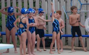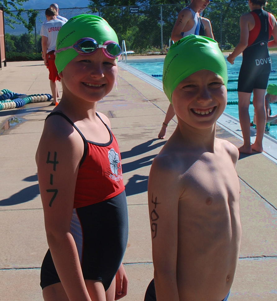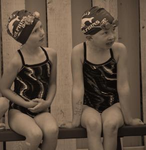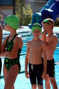 The 8 and under group waiting to swim. Alice and Sam are right in the middle. Not sure what they were talking about?!?!?