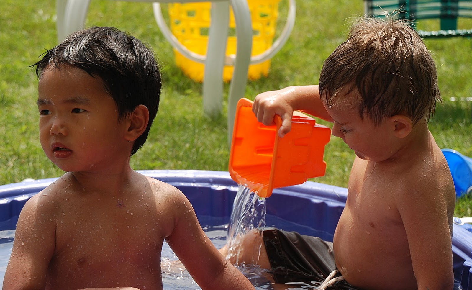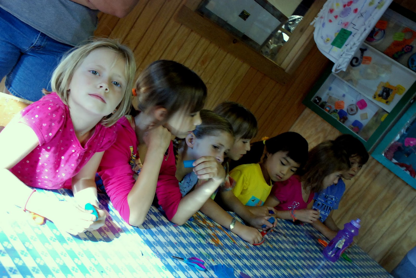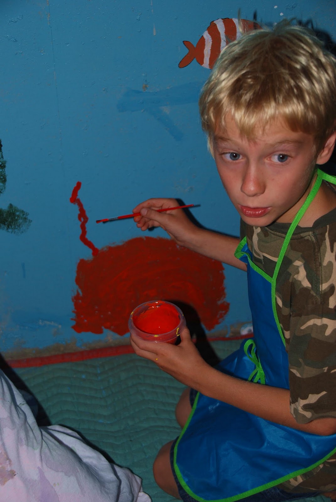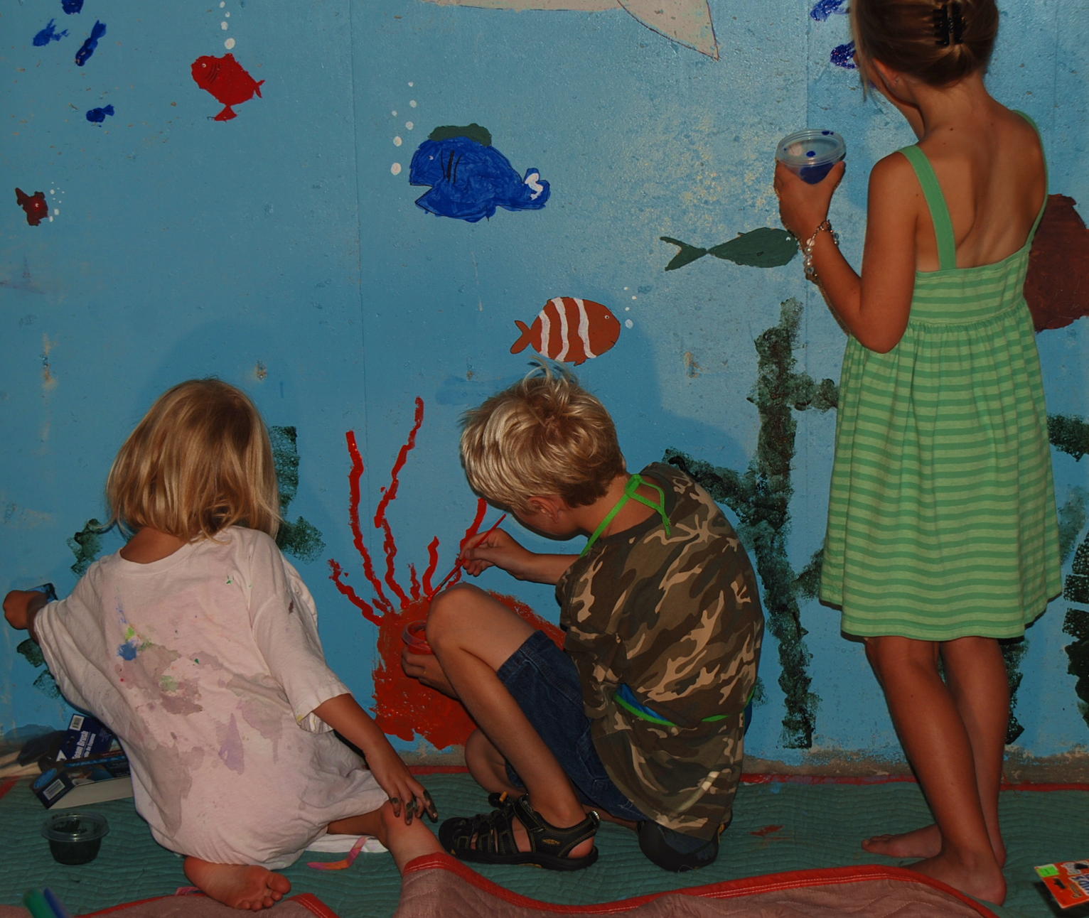 In sticking with our summer schedule we finished our mural as our art project yesterday. Sam added an anemone, Alice painting a school of blue fish and Paige completed the bottom of our mural with seaweed. They were very proud of their creation and have already decided that we will paint a beach scene next summer. They informed Scott last night at the dinner table that they would like to put it on the gym wall. He didn’t seem quite as excited as them. Huh?! I wonder why?!?!?