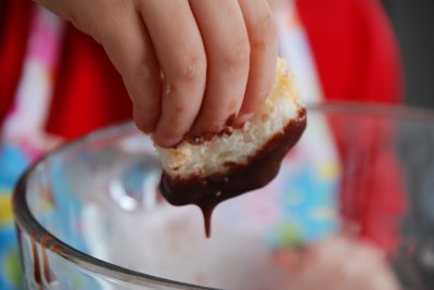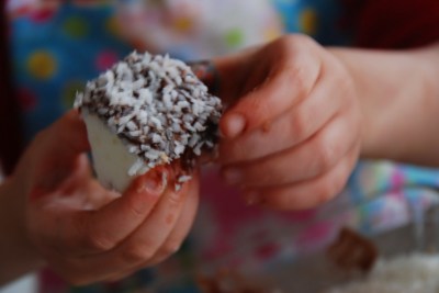 For the last month, Paige’s kindergarten class has been studying a few different countries.  This week is Australia.  When Paige’s teacher sent out the email looking for a parent to make and bring in food from each country, I scrolled down to the last week possible and signed up for that date.  April 21st. A month ago, it seemed easy.  Bring in Australian food. Granted I have never been to Australia and I have no idea what Australians eat.  Soooo, this past weekend I did what every good mom does and I Googled it.  I found a very yummy recipe that included sponge cake, chocolate and coconut.  That seems universal to me.  I’m just sayin’.  Anyway, Paige and I got out the aprons this afternoon and made some very deliciously Australian Lamingtons.  Here is the play by play.