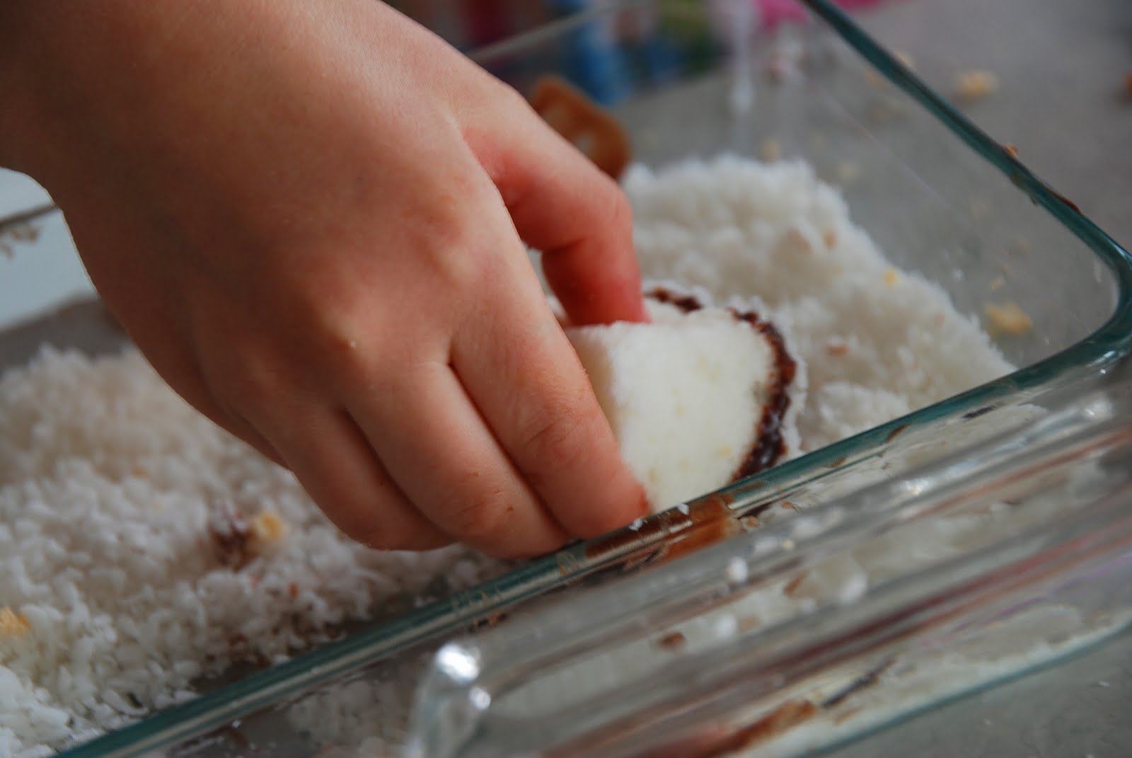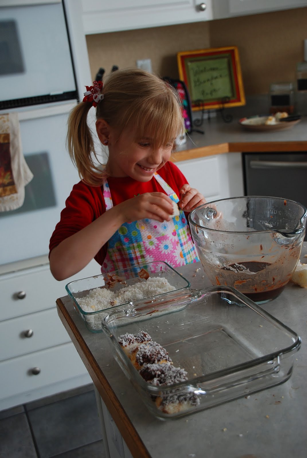 For the last month, Paige’s kindergarten class has been studying a few different countries.  This week is Australia.  When Paige’s teacher sent out the email looking for a parent to make and bring in food from each country, I scrolled down to the last week possible and signed up for that date.  April 21st. A month ago, it seemed easy.  Bring in Australian food. Granted I have never been to Australia and I have no idea what Australians eat.  Soooo, this past weekend I did what every good mom does and I Googled it.  I found a very yummy recipe that included sponge cake, chocolate and coconut.  That seems universal to me.  I’m just sayin’.  Anyway, Paige and I got out the aprons this afternoon and made some very deliciously Australian Lamingtons.  Here is the play by play.