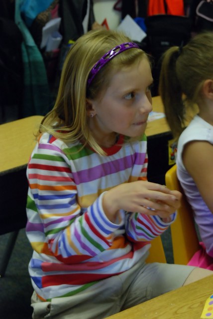 After the yummy treat, her teacher let her pick out a game to play with the class and she chose Hangman. Scott got to be the Hangman artist. I could tell that Alice loved having her Dad right up there with her. She picked big long words like Interesting and Satisfied, coming very close to stumping her classmates.