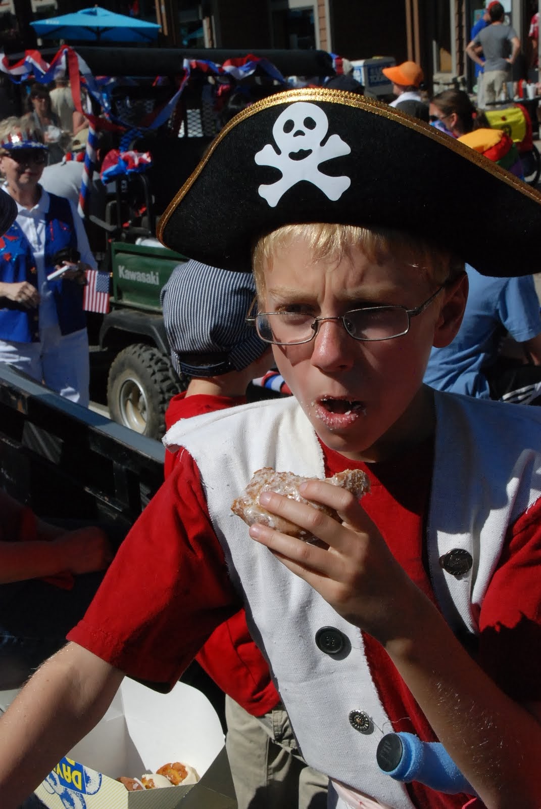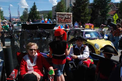 We are on vacation in Breckenridge, one of our favorite places in Colorado. We are spending the week relaxing and enjoying family and friends. Life is so good. Yesterday on the 4th we participated in the Breckenridge Parade. Last year we had so much fun that we knew we would do it again. And we did. We really did it this year. I am talking about pint sized pirates, a water canon, water balloons, candy coins, frisbees and much more. We decorated the trailer with black plastic sheeting, a mast and sail and pirate flag. We even had a few parrots “hanging” around. All the kids (and some adults) were dressed in their finest pirate garb and we took Breckenridge by storm and water balloon. We got really wet and had way too much fun!!!! Look out next year Breck, we are already planning our next attack!