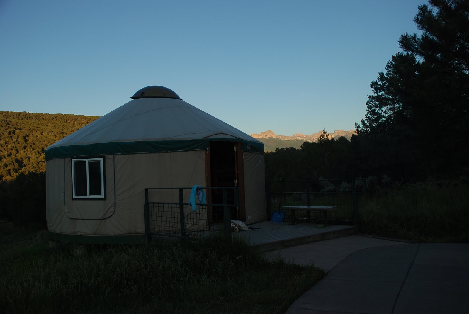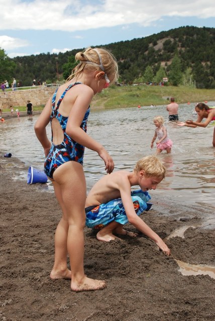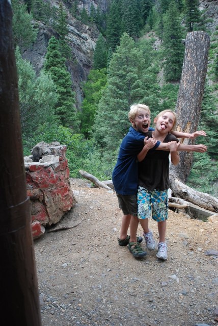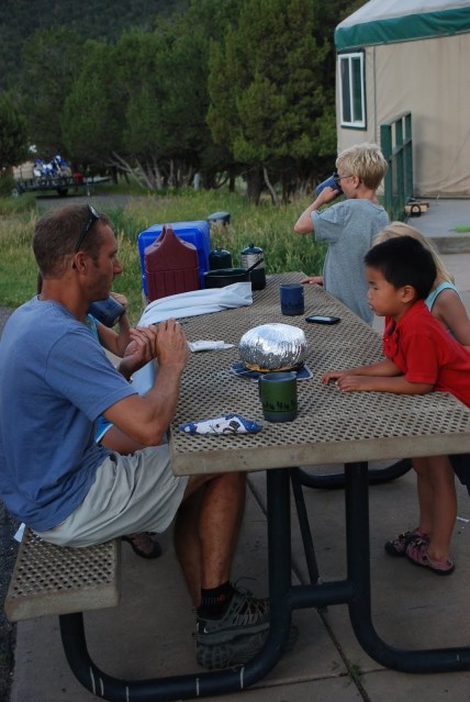 Yurting. Doesn’t it sound so nice and fancy. Like a hike could be a mere jaunt in the woods. Yurting is our version of camping light. Instead of putting up the tent and sleeping on the ground we drive up to our yurt and lay sleeping bags out on bunk beds. Very comfy and plush compared to, well, the ground. Don’t get me wrong, we love to tent camp. It is a great way to vacation around the state on the cheap. This past weekend we headed southwest to the Ridgeway/Ouray area. The San Juan mountains tower over this part of Colorado and it could be one of the most beautiful areas we have visited. So, we reserved a yurt in the Ridgeway campground and got busy checking out the area. Highlights of the weekend included hot springs, Ridgeway beach, waterfalls, steep cliffs, charades around the campfire and Frosty’s (hey, we gotta keep all these kids quiet somehow!)