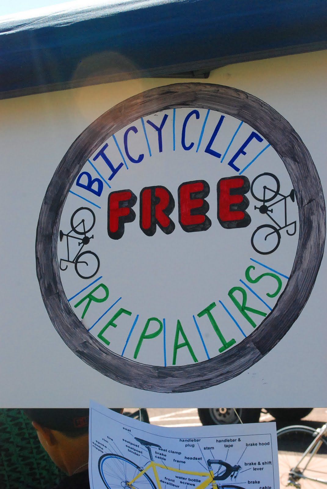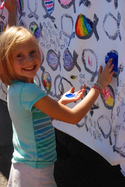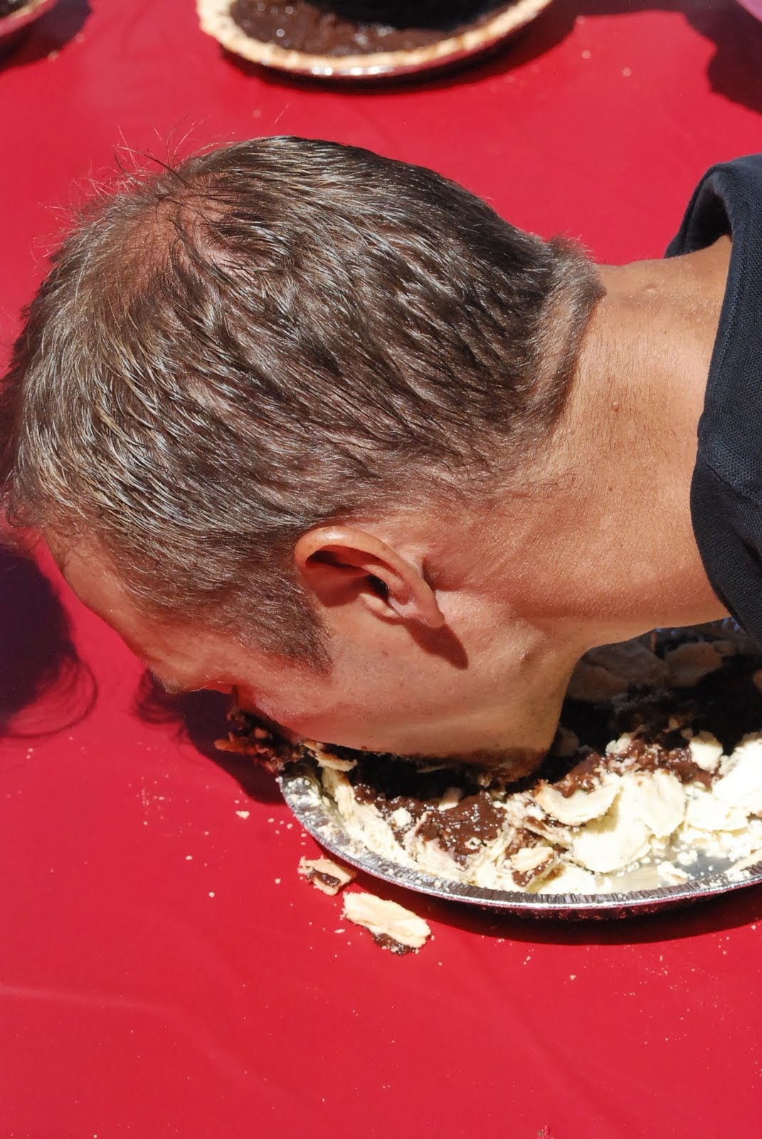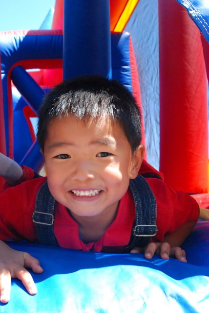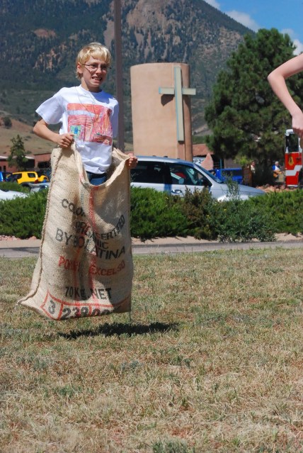Today we spent most of our day at church. Twice a year we have a community block party at our church. All is free, open to anyone, lots of good fun. The kids had a blast, running around like crazy between bounce houses, crafts, balloon animals, games, food and events. It was a gorgeous Colorado day and we thoroughly enjoyed ourselves. Again this year Scott had his bike repair tent and had tons of bikes stacked up for sizing, tuning and fixin’ up. He did step out of his tent to participate in the pie eating contest. And….he won. Now he is belly-aching about eating soooo much pie.