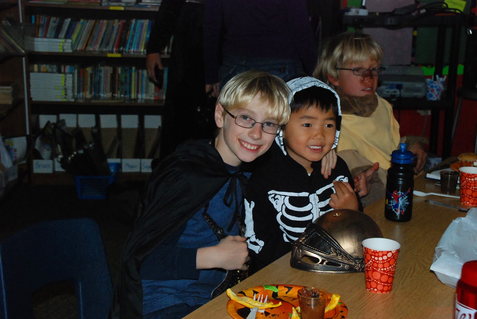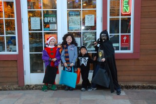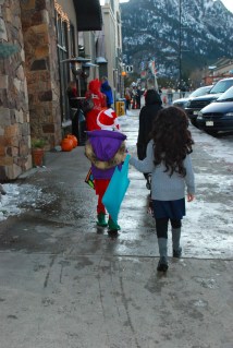 Yesterday we celebrated Halloween, Frisco style. The kids celebrated in their classrooms during school and then we walked downtown for trick or treating. Downtown Frisco closes down for two hours and all the Main Street stores passed out candy. Who knew that every kid in the county would head to Frisco for the good stuff. We passed out candy from our store and we went through 5 huge bags of candy. There were little kids (and big ones too) everywhere! Our kids had a blast running from store to store and Mason and I just trailed behind them. Once their bags were overflowing, we headed back to our store to check and sample the loot. Usually we combine all the candy and then eat a piece a day for about a week and then I start throwing it out. This year we are going to pick out a few of our favorite pieces and then send the rest to Uncle Mick in Afghanistan. All the kids thought that was a grand idea. This year we had a Christmas elf, Hermione Granger, a skeleton and a hooded knight. I might be a bit biased but they were the cutest trick or treaters around town.