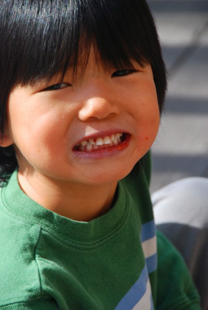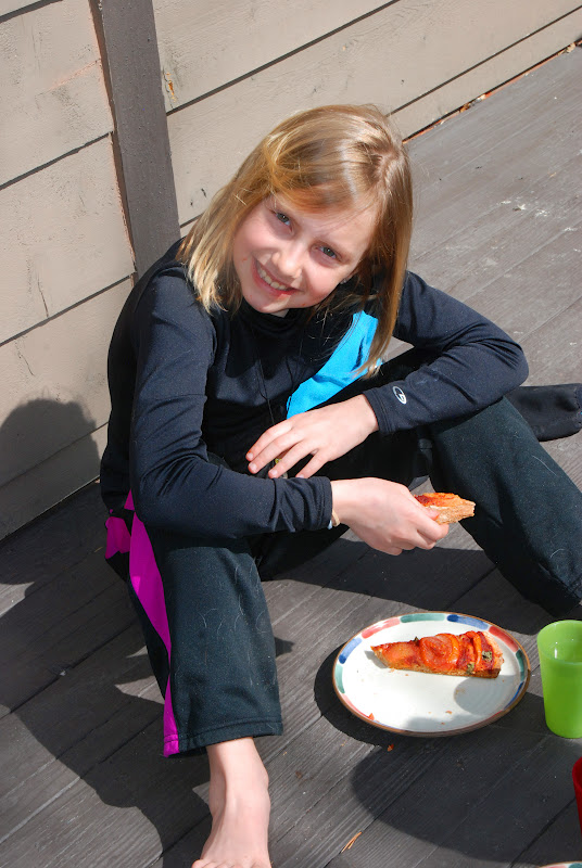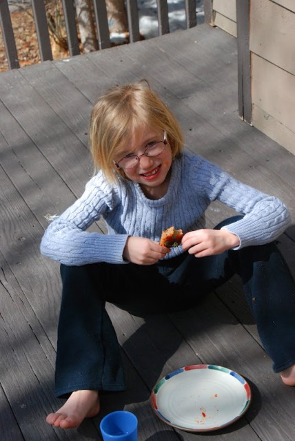 Please excuse the pizza sauce on these cute faces and yes, we are eating on the ground. That is how we roll around here. Did you notice that we have no cheese on our pizza? If you have watched the documentary Forks Over Knives, you get it. If you haven’t, it’s really good, informative and will scare the &%$ out of you….or at least the cheese off your pizza!