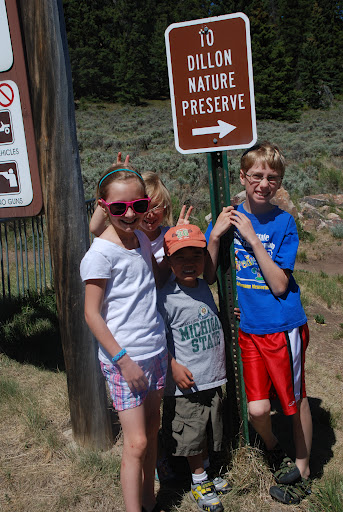 Today, because we had to be out of our house for a few hours (remind me later to tell you how much I love house showings), we headed out for our first summer field trip. Because I didn’t have any need to be in the car for more than a few minutes (read: we’ve been in the car a lot), we chose one of our field trips that is here in town. We headed over to the Dillon Nature Preserve. The kids thought it looked suspiciously like a hike but I assured them that it would be way more. Well. It was pretty much a hike BUT it was an especially nice hike that cruised along the edge of one of the many peninsulas on Lake Dillon. We even stopped for some rock skipping in the lake. All in all, a thumbs up on this stop. Next week, I may decide to venture out of the county 🙂