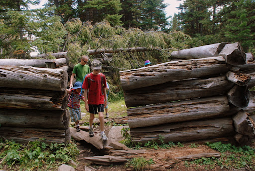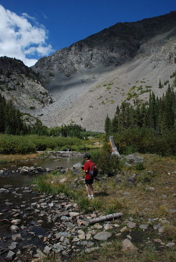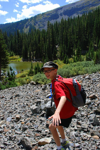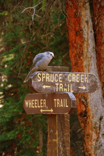 Well, after hiking 2.5 miles we arrived at Mayflower Lake. It was so beautiful, right at the base of the bowl. We had fun exploring around the lake and hiking up into the bowl a bit. Scott and I knew that it would take a while to hike back down so we decided that the falls and the upper lake would have to wait until next time. Mason’s little legs get tired and we didn’t want to push it. We were super jazzed that we made it to the first lake. We saw cool old mining cabins along the way and had fun jumping over streams and finding tree bridges. The falls were gorgeous, even from afar and now we know that we have a new destination to look forward to 🙂 This bird below was stalking us, hoping that someone might drop a pretzel. The kids named him Fluffy. They, of course, knew exactly what type of bird Fluffy was but I don’t remember.