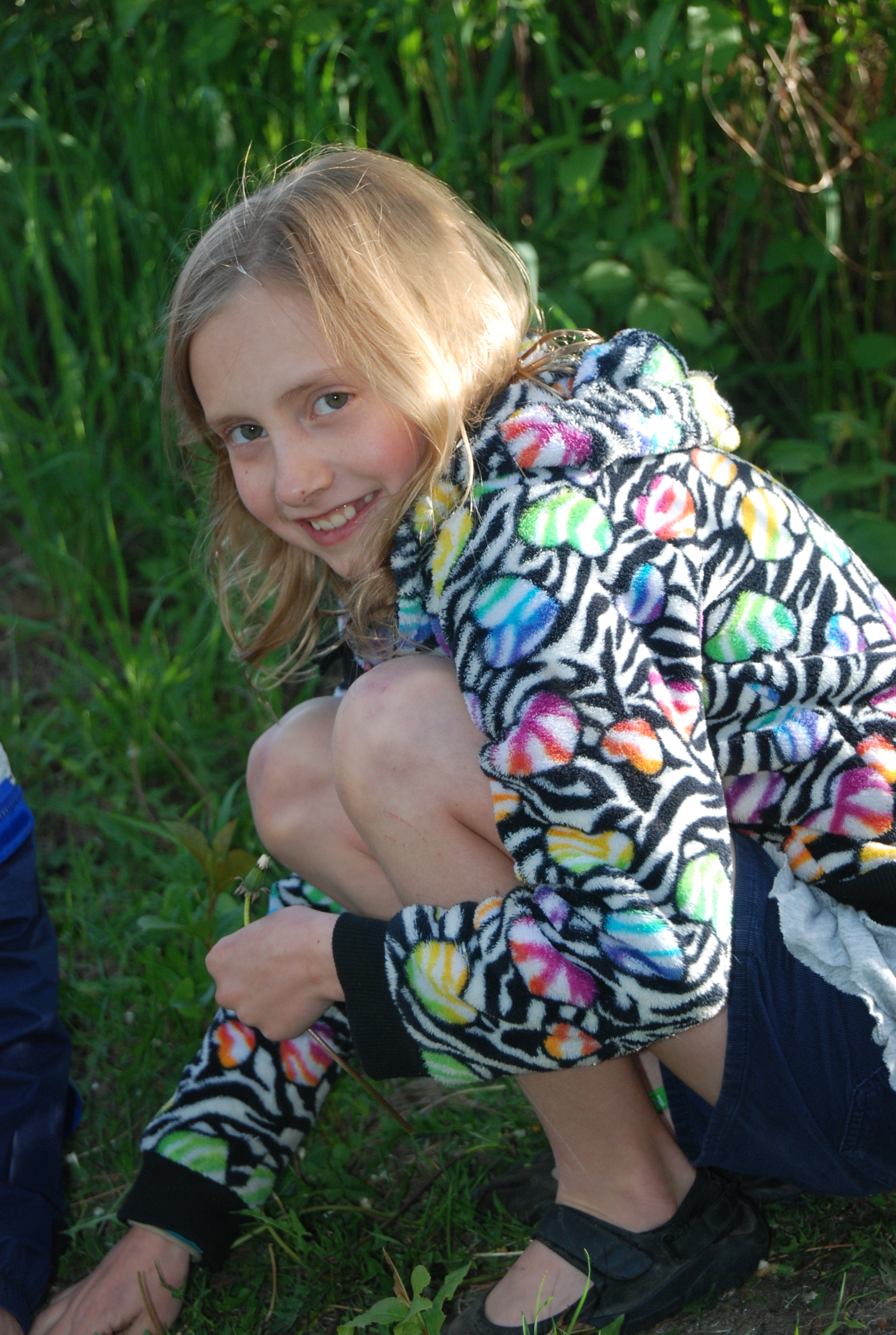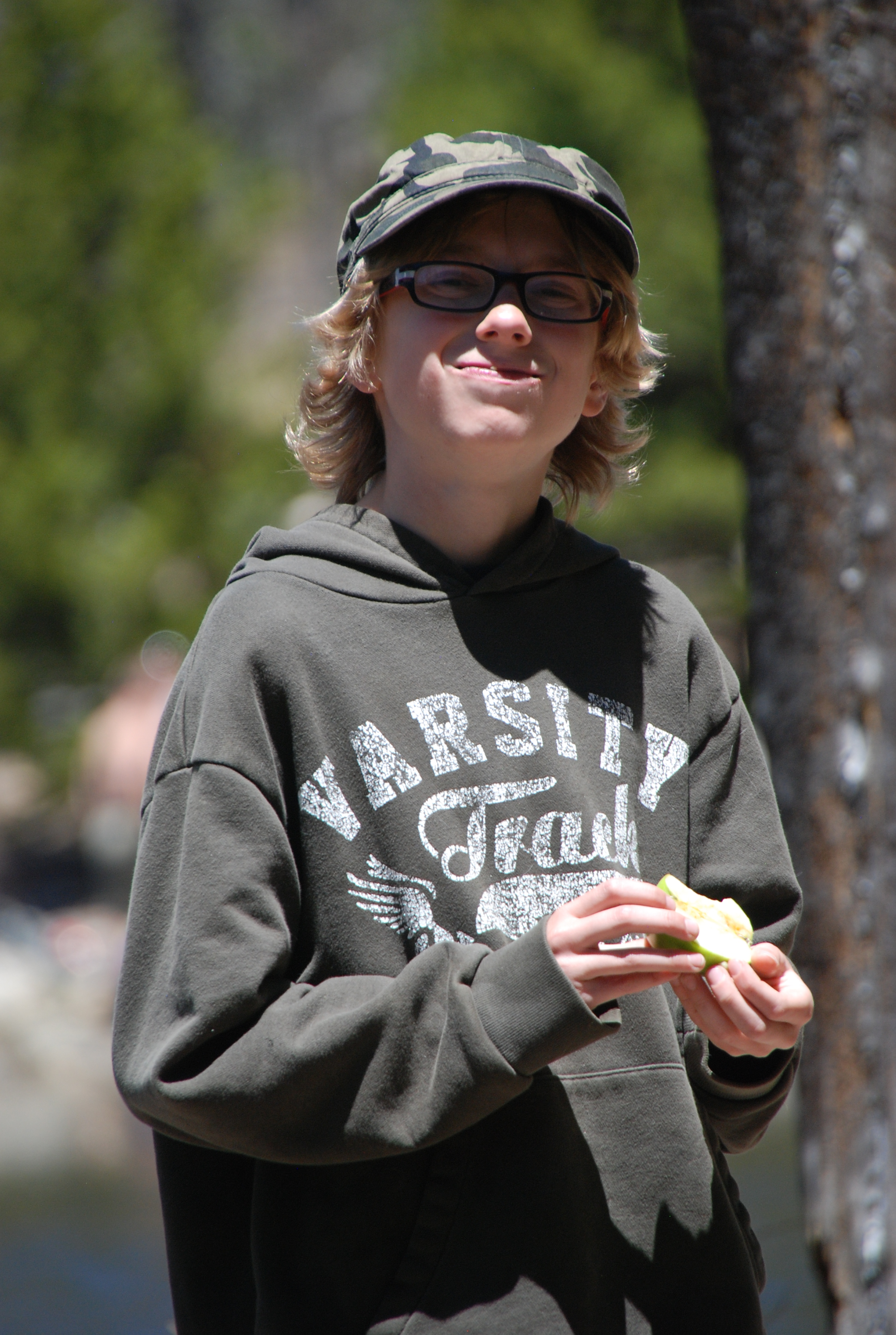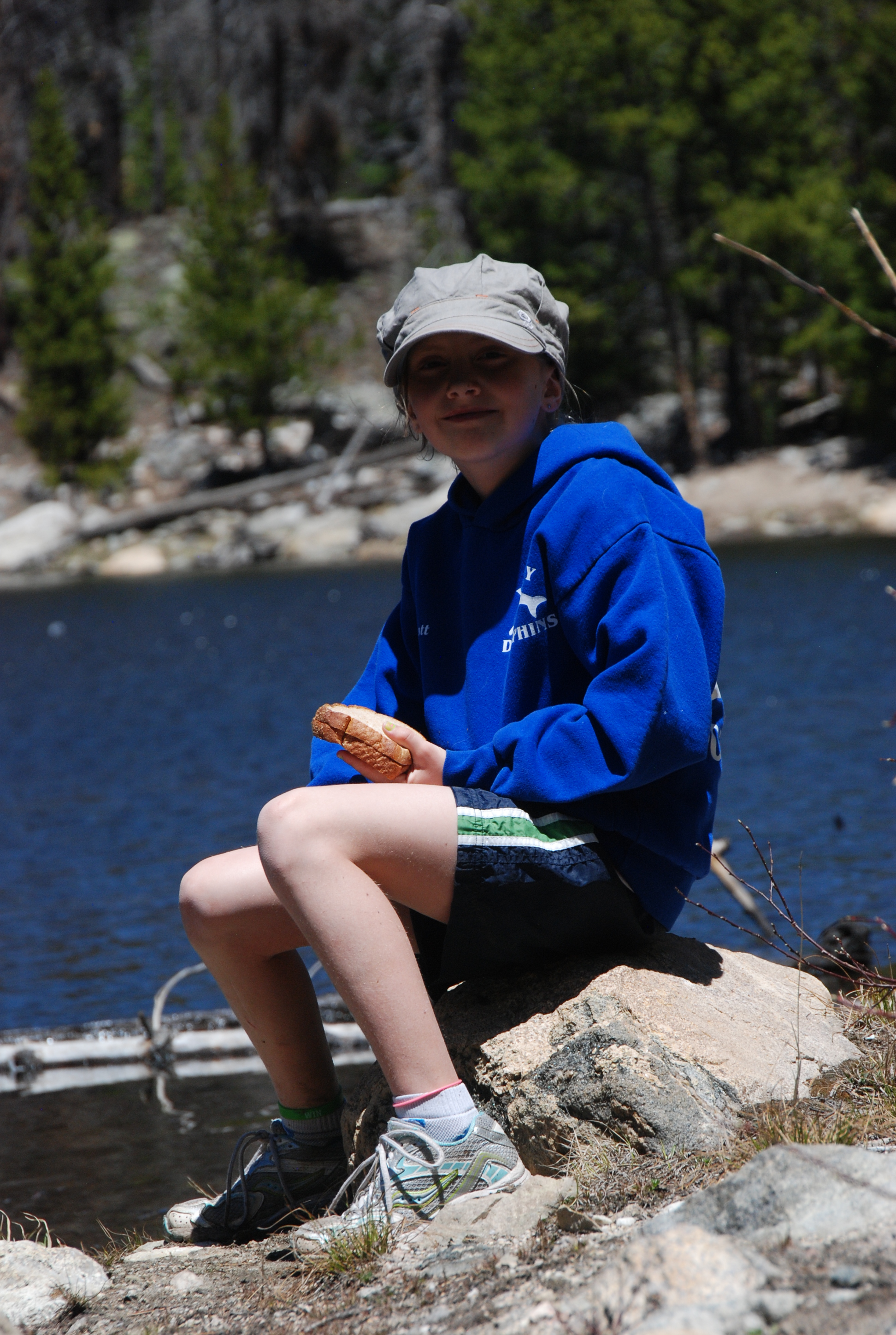Hat, sweatshirt, hiking shoes, snack. She is prepared:)
