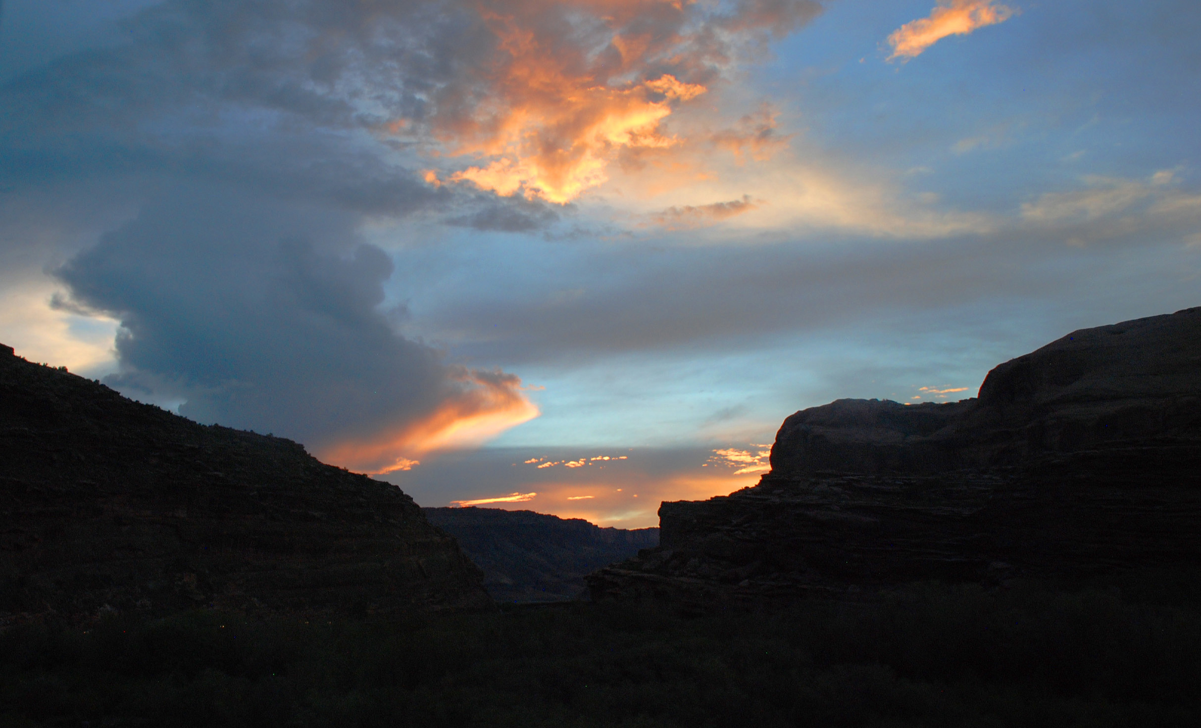We headed west bright and early on Saturday morning and got to Moab around lunch time. I will give you one guess on weather. Yep, raining. Unbelievable. We put the tent up in the rain, walked around downtown in the rain and then called uncle and headed inside for some dinner. By that point I was not in the mood to grill hot dogs, in the rain. After we left the restaurant, the black clouds seemed to be clearing so we took the kids for a drive to find dinosaur tracks. We were unsuccessful but we did find some great hiking and killer views of the sunset. The weather was coming around to my way of thinking.