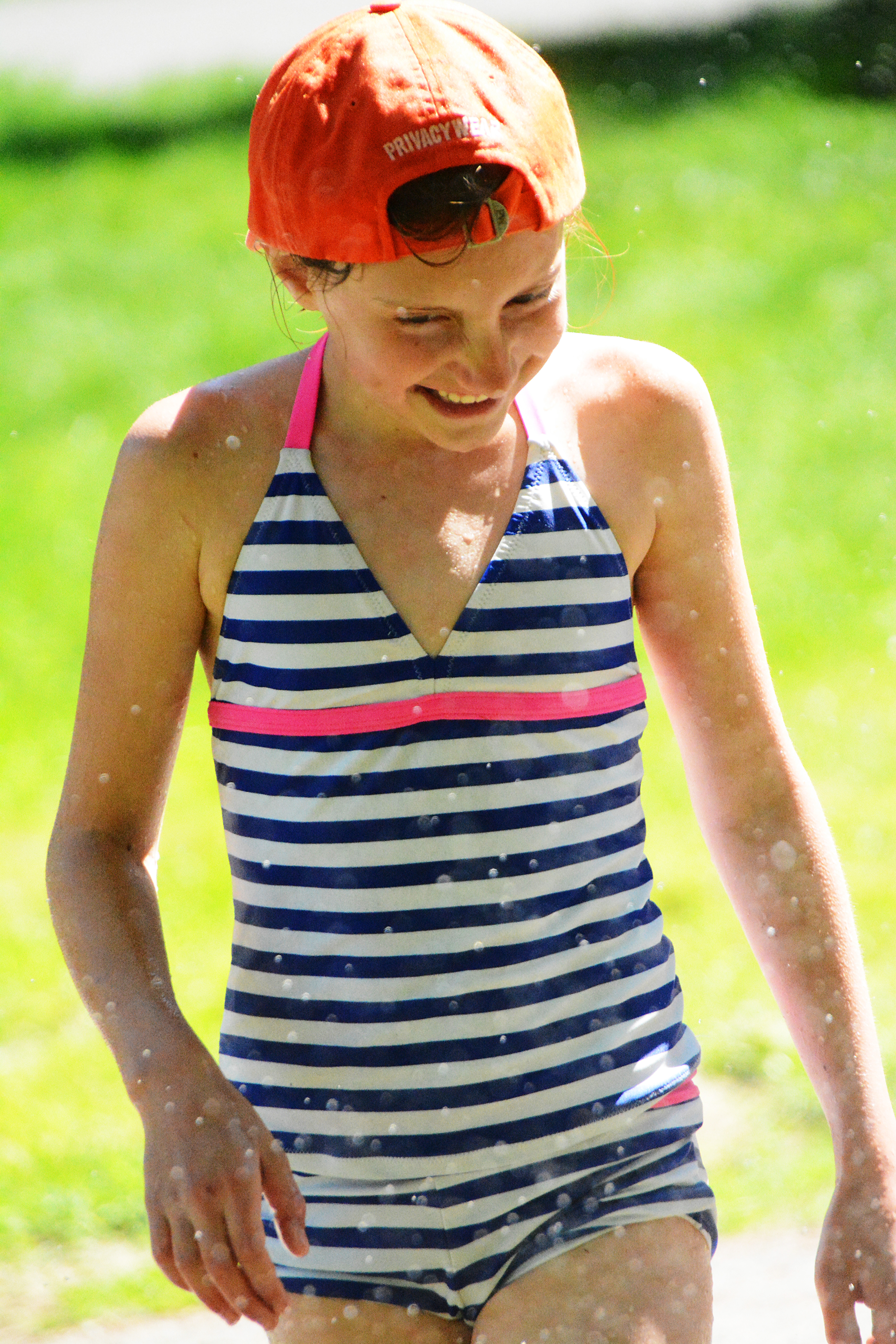 Now that summer has finally arrived, we are letting it all soak in. After a trip to the park, picnic and sand castle building at our local “beach”, the kids were hot and tired so we hooked up the sprinkler and almost everybody took advantage of it. One of my babies seems to be too cool for running through the sprinkles. The other three had a blast.